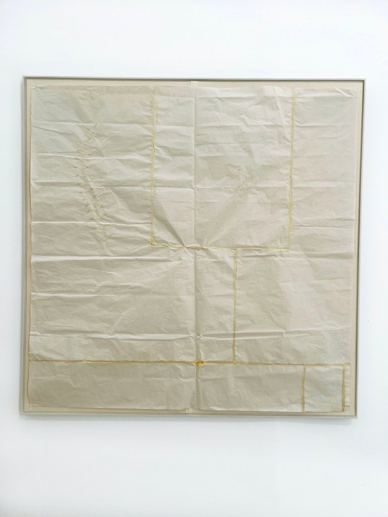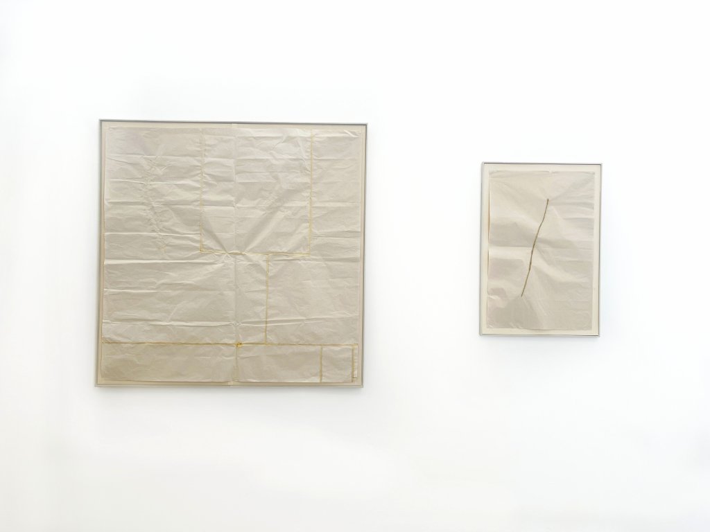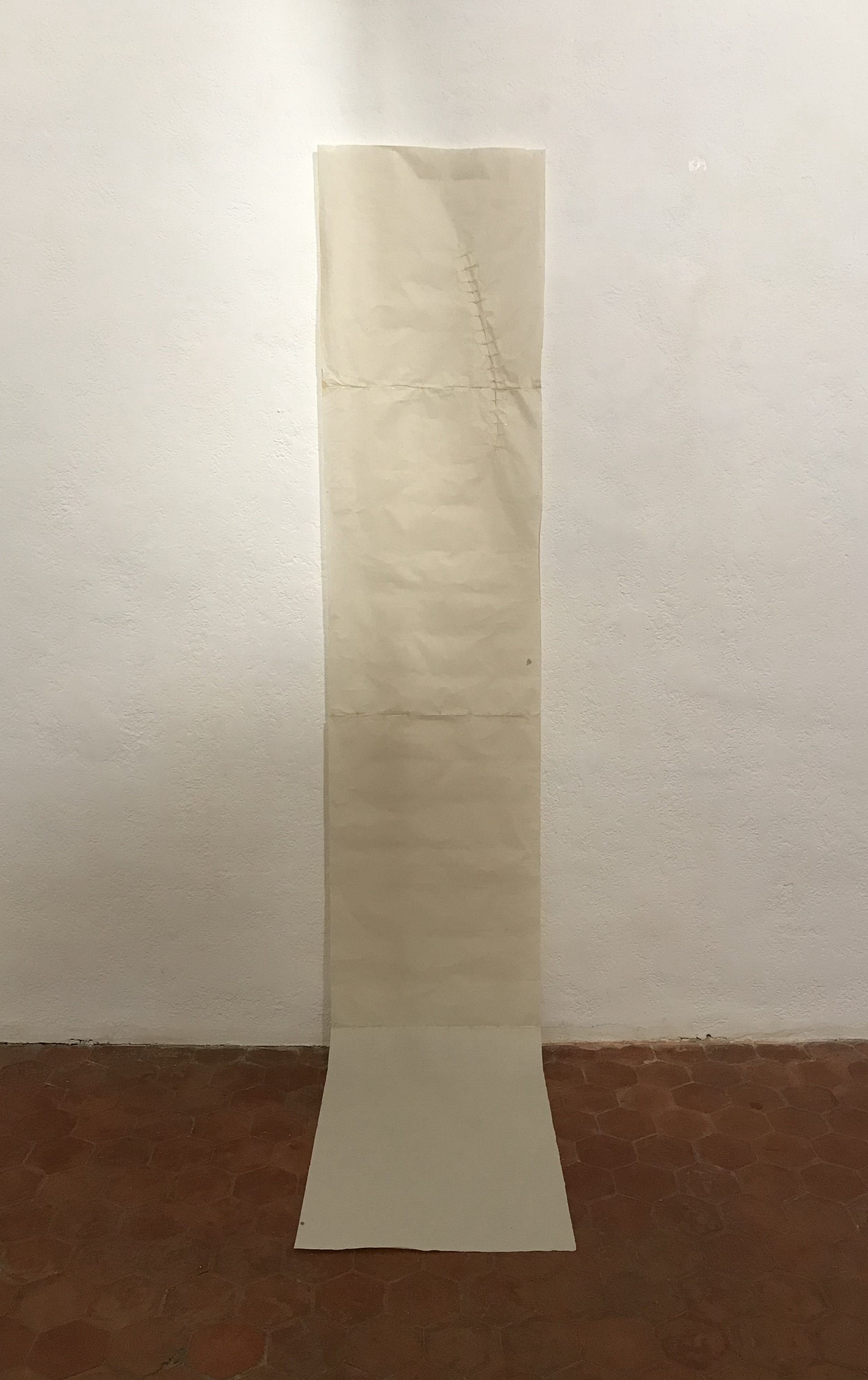Une grande feuille de papier très fin en format carré est accroché sur le mur. N’étant pas collé à la paroi, il flotte un peu. Une autre feuille rectangulaire est accrochée à côté, très longue elle traîne jusqu’au sol. Il y a très peu de choses sur ces feuilles. Le dessin est formé par le latex qui y est apposé. Des cicatrices sont dessinées au latex : un long trait entrecoupé par de plus petits traits perpendiculaires. Le latex est décollé du papier, sauf aux extrémités. Il soulève le papier, le tire. Des ombres se créent dans les creux et les bosses du papier.
