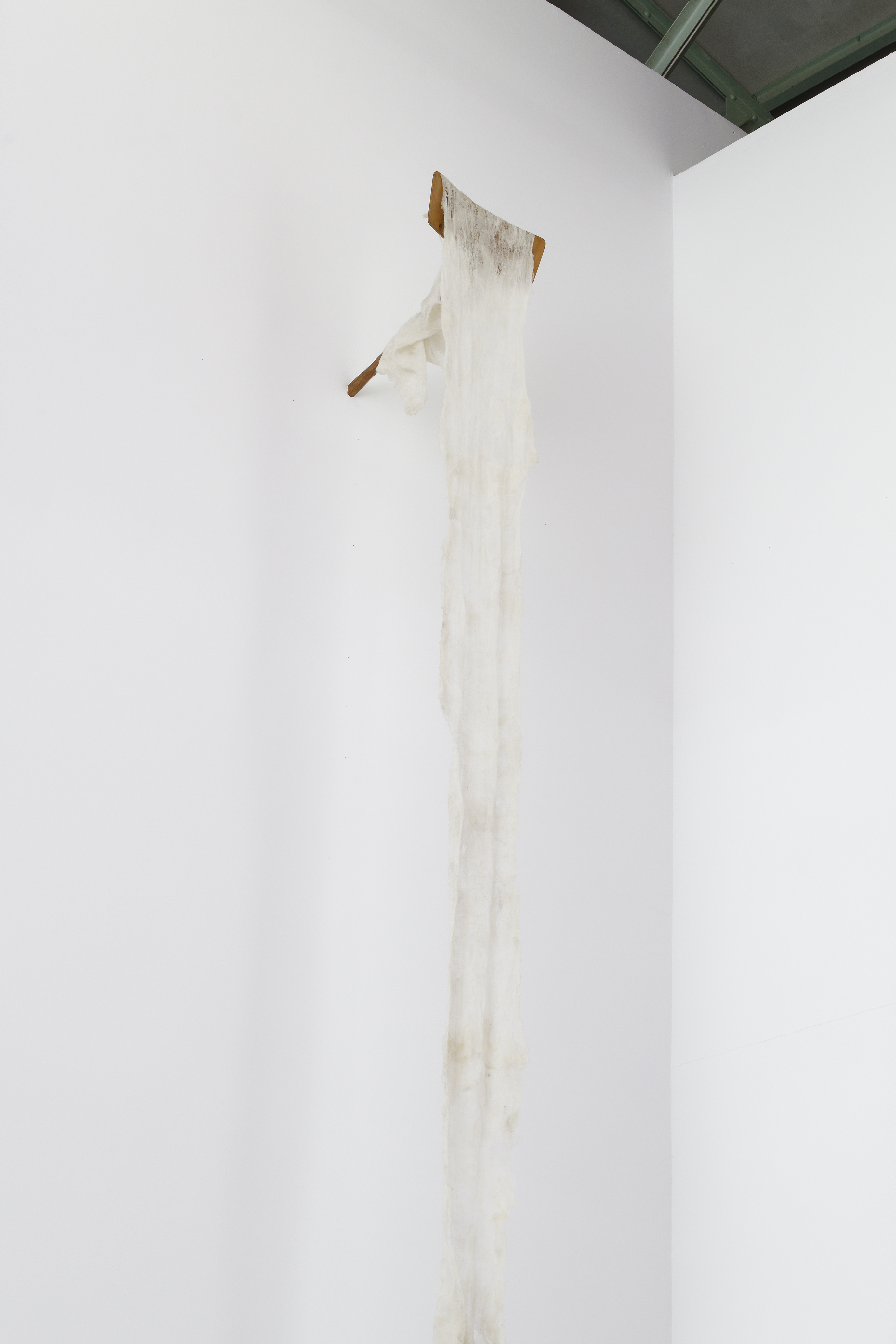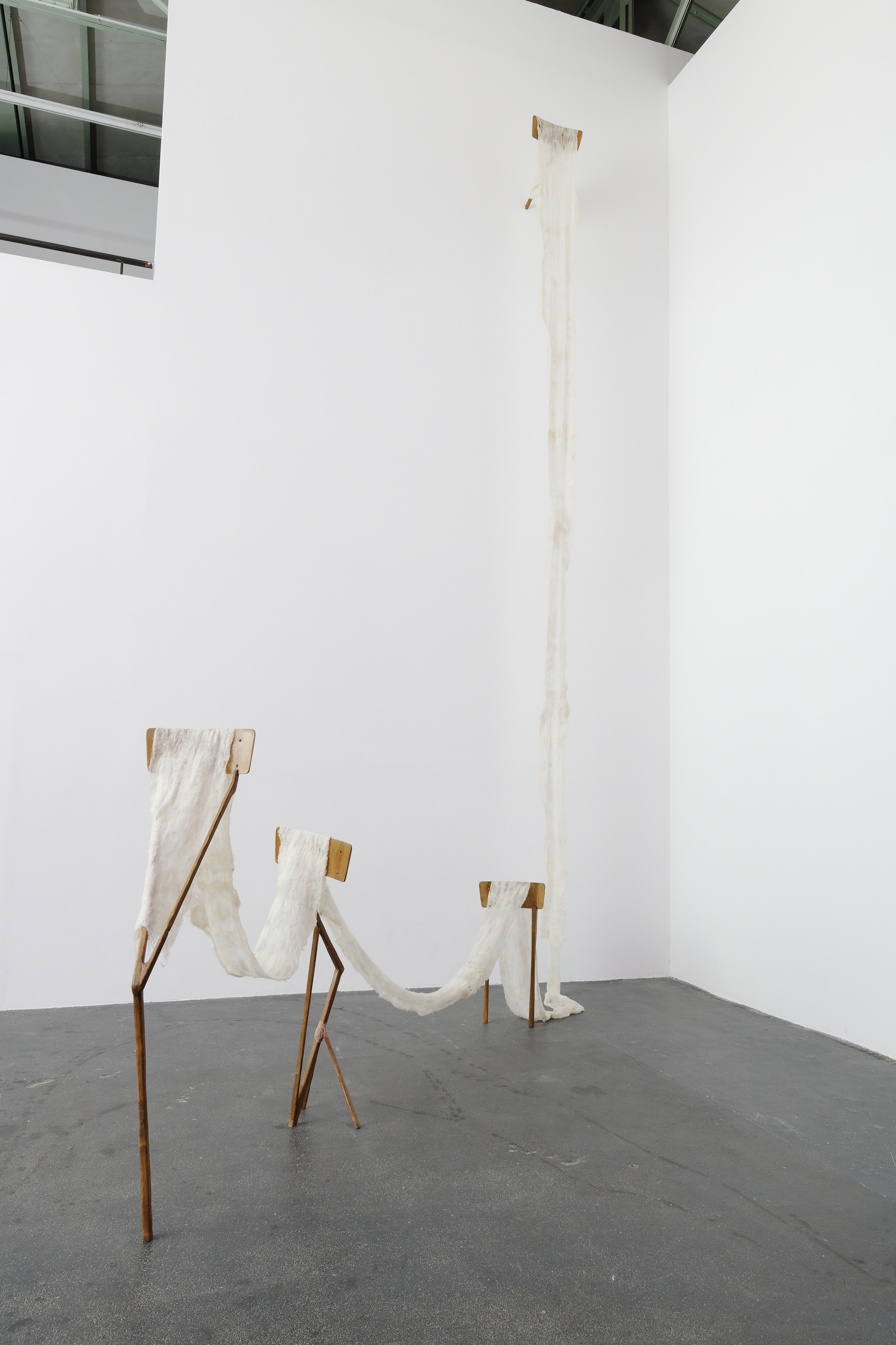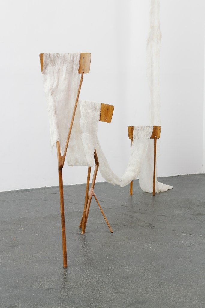 A 6 mètres de hauteur, un dossier de chaise en bois (style chaise d’école) est accroché grâce à un manche en bois. Il est placé parallèlement au mur, prêt à accueillir un dos. Une fine bande de tissu blanchâtre légèrement translucide est posée sur le dossier et son manche, sur le devant du dossier elle tombe en cascade, jusqu’au sol. On se rend compte que le tissu est un feutrage très fin, les fibres de laine n’étant pas parfaitement agglomérées entre elles. Il est recouvert d’une substance étrange, du silicone qui lui donne une apparence humide, visqueuse. Une fois sur le sol, ce pan de tissu très long continue son chemin et est vite relevé par trois autres structures, composées d’un dossier de chaise identique au premier et du même bois. Sur la première structure, le dossier de chaise tient sur deux bâtons uniquement. Sur les deux autres structures, le dossier est maintenu par des bâtons rejouant des formes de béquilles, instables. La deuxième tient sur trois pieds, reliés grâce à du k-tape (bande kinésiologique élastique). La troisième ne tient que sur un pied. Chacune des structure ne pourrait pas tenir sans cette bande de tissu qui les recouvre, l’une après l’autre.