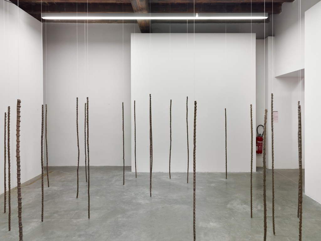 Dans une pièce, 25 tiges d’un brun foncé sont suspendues depuis le plafond. On dirait qu’elles touchent le sol, mais elles flottent à environ 1 centimètre au-dessus. Les tiges sont fines, arrondies et dotées de fines crêtes horizontales qui sont espacées régulièrement de quelques centimètres. Elles ne sont pas très droites. Les tiges font toutes entre 1m40 et 1m75 de hauteur. Elles sont parsemées dans l’espace, de manière irrégulière. Certaines sont très rapprochées et plus d’autres éloignées. Elles laissent un passage d’1m20 au centre de l’installation, afin de pouvoir se déplacer parmi elles.
