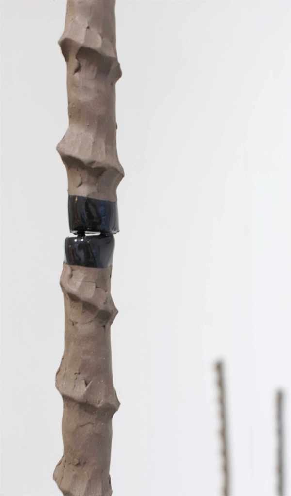 Renforcements est une installation en constante évolution. Les sculptures qui la composent jouent sur la tension entre droiture et fragilité. Inspirées des fers à bétons (tiges de métal consolidant les murs de nos architectures) les tiges sont modelées à la main, puis cuites. Leur aspect fait écho à des éléments du corps, des vertèbres empilées, des os. Les tiges d’argile se brisent souvent mais sont reconstituées pour former des tiges toujours plus grandes et être montrées d’exposition en exposition.